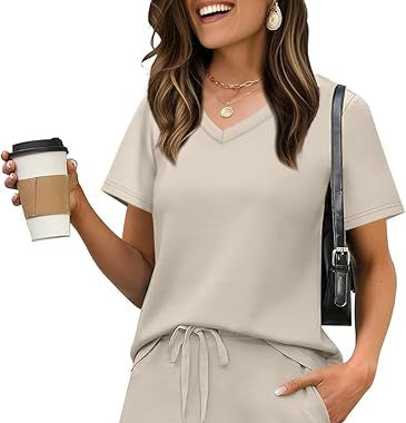 - Feature: This chic set includes a cozy V-neck pullover with short sleeves and elastic-waisted pants featuring two practical pockets. The solid color loose-fitting design create a laid-back silhouette, ensuring it’s an essential staple for your wardrobe.